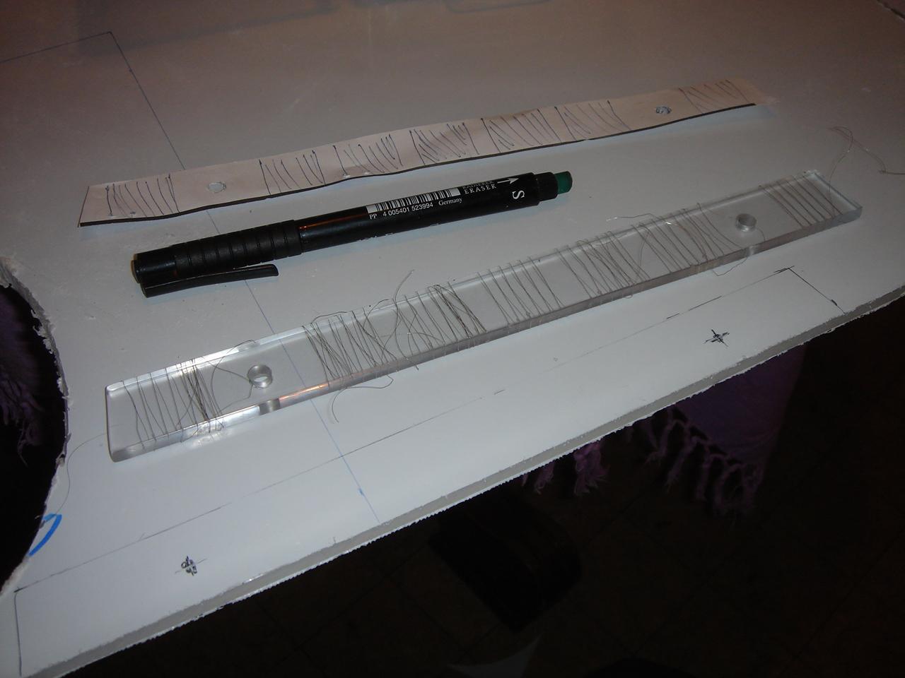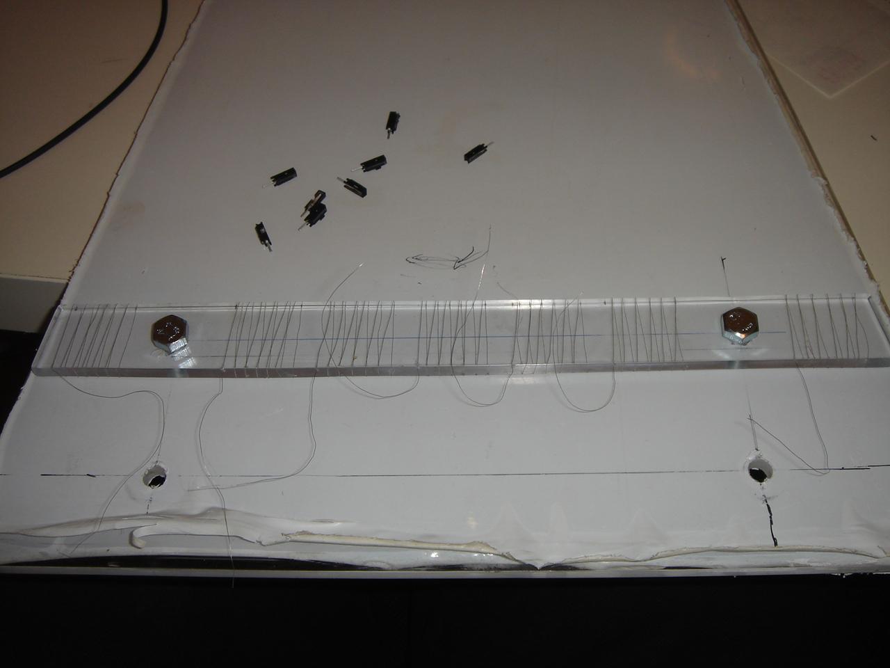 The job was to somehow fix a set of thin wires like the ones I used for the small sensors, behind each line engraved on the panel.